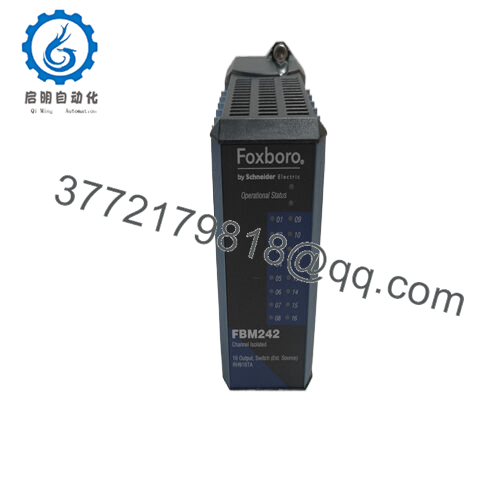 In industrial automation, where discrete actuators like solenoids and relays demand unwavering command execution to prevent erratic machine behavior or safety interlocks from failing, engineers routinely confront the pitfalls of non-isolated outputs that invite noise coupling, ground faults, or overloads in expansive control networks, eroding process control precision and inviting unplanned halts. The FOXBORO FBM242 RH916TA confronts these issues as a sixteen-channel discrete output interface module, supplying galvanically isolated switching for externally sourced loads that upholds signal reliability without propagating faults across shared circuits. This module emerges as a cornerstone in deployments such as modernizing conveyor sequencing in mining operations or fortifying alarm panels in wastewater facilities, where coordinating dozens of on/off devices under variable electrical stresses requires fault-tolerant I/O to dodge production snags. Envision a steel rolling mill with synchronized valve banks exposed to inductive kicks and harmonic distortion—the FOXBORO FBM242 RH916TA channels precise DC or AC pulses to effectors, quelling transients that could otherwise spark spurious trips and cascade into mill downtime. Centering on imperatives like modular scalability and diagnostic transparency, it equips teams to erect resilient automation frameworks that evolve with throughput demands, curtailing the rework of daisy-chained wiring prone to voltage sags. For veterans in industrial automation and process control, the FOXBORO FBM242 RH916TA is pivotal amid shifts to high-density I/O racks, where its channel isolation thwarts common-mode interference, preserving high-reliability outputs in EMI-saturated zones. It dovetails with aims of streamlined loop management, offering per-channel status feedback that pinpoints actuator stalls before they compound, all while embracing external excitation for flexible voltage matching. Fundamentally, this module recasts output orchestration from a fragility to a fortress, granting you the latitude to hone sequential logics over fretting about electrical echoes in rigorous process realms.